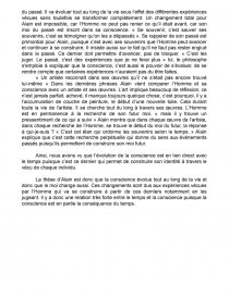 Ensuite, Alain aborde le sujet de l’évolution de la conscience à travers la vie de l’Homme ainsi que la construction de l’identité personnelle. « Si l’on se retrouvait tout entier, c’est alors que l’on ne se reconnaîtrait pas ». Ici, le philosophe explique que pour lui il y a différents moi qui se succèdent au cours de la vie. Le fait de vivre des expériences, l’ont changé, construit et ont fait de lui un autre moi. Pour Alain «Le passé est insuffisant, dépassé» car il a changé. Il ne se reconnaît plus dans ses « moi » du passé, ils leur manquent des connaissances qui font qu’il a changé que c’est un autre moi. « Ce moment-là même j’étais autre chose en espérance, en avenir » L’auteur montre qu’être conscient, c’est exister dans le temps, ce qui rend impossible le fait de vivre dans le présent. L'Homme fantasme sur le futur, il espère, sauf que l’être humain n’a aucune maîtrise sur le déroulement des événements futurs, il ne peut donc qu’être déçu. Il n’est pas devenu ce qu’il voulait, ce qui rend inaccessible le bonheur à l’Homme. « La conscience de soi est la conscience d’un devenir et d’une formation de soi irréversible, irréparable » De part cette phrase Alain ajoute qu’être conscient, c’est savoir que les événements du présent vont toujours s’inscrire dans le passé, inexorablement. Ainsi, l’Homme va obligatoirement changer, grandir, devenir nostalgique sans retour en arrière possible, ce qui va compliquer sa quête du bonheur.