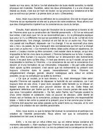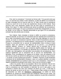 Tout d’abord, Alain s’emploie à donner à définir ce qu’est la conscience. «Dans le sommeil, je suis tout» et il commence par son opposé avec le sommeil qui est un état d’inconscience dans lequel il ne peut donc pas distinguer le moi et le monde, car seule la conscience le permet. Dans un état d’inconscience comme le sommeil, il ne distingue plus le monde extérieur, c’est pourquoi il se confond avec. Puisque la conscience est un pouvoir de représentation dans le temps et dans l’espace. Dans son sommeil il est dépourvu de ce pouvoir. « La conscience suppose réflexion, division» Ici l’auteur aborde pour la première fois le mot conscience, il explique qu’avoir une conscience signifie passer de l’opinion, par nature sans fondement, à la pensée qui demande tout un processus de réflexion. En effet, ces interrogations vont permettre l’accumulation de connaissances. Alain explique également que la conscience est un pouvoir de représentation, qui témoigne d’une connaissance de l’espace et du temps, c’est une présence à soi ainsi qu’aux autres qui permet de distinguer qui on est du monde qui nous entoure. « Je pense, et puis je pense que je pense ». Toutefois, l’Homme n’a pas seulement conscience de sa représentation physique, il peut, en y prêtant attention, se rendre compte immédiatement qu’il pense et donc qu’il a une conscience. C’est donc un rapport immédiat de la pensée à elle même, c’est ce qui se nomme le cogito.