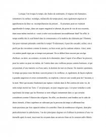 Lorsque l’on évoque le temps, des foules de sentiments, d’origines très humaines, remontent à la surface: nostalgie, mélancolie du temps passé, mais également angoisse et appréhension du futur ou incompréhension du présent… Et pourtant, peut-on vraiment appréhender le temps, dans son aspect magistral et abstrait, du point de vue de nos ressentis, étant nous-même mortels et voués à subir son écoulement inexorablement fatal? En effet, le temps semble être le seul bémol dans la connaissance et la maîtrise des éléments par l’Homme. Qui peut vraiment prétendre contrôler le temps? Évidemment, il peut être encadré, utilisé, mis à profit par des inventions comme la montre, ou bien avant, par les cadrans solaires. Ainsi, notre vie entière paraît régie par ce temps tout puissant. On se définit bien souvent par son âge d'ailleurs, ou alors, au contraire, on tente de le dissimuler, dans l’espoir d’en effacer les preuves, pour les autres ou pour soi-même, de l’entrée dans une vieillesse perçue comme honteuse, et qui est pourtant, d’une manière ou d’une autre, la destinée de tout un chacun. De manière spontanée, le temps qui passe nous fait donc souvent penser à la vieillesse, et, également, de façon explicite à grandes angoisses et crises existentielles, ou implicite, à travers une sourde peur de l’inconnu, à la mort. Mort qui incarne finalement une rupture violente dans le flot continu de notre vie, de notre temps mortel sur Terre. C’est pourquoi, on peut imaginer que c’est pour remédier à cette suprématie du temps que les Hommes se sont réfugiés notamment dans ce que certains considèrent comme l’illusion des religions. En effet, ces dernières sont fondées sur le culte de dieux éternels, d’êtres suprêmes ne subissant pas la pression du temps et affirmant leur toute-puissance par leur capacité même à le contrôler. Dans de nombreuses religions, dont plus particulièrement le catholicisme, l’un des principaux dogmes est d’ailleurs la promesse d’une vie éternelle après la mort, inscrivant les croyants dans un univers futur où ils seraient enfin libérés de l’emprise du temps qui passe. Toutefois, cet univers utopique ne s’inscrit-il pas dans notre monde réel? De tous temps, les Hommes ont rêvé en observant les étoiles, astres inatteignables et paraissant éternels. L’espace, immensément grand, infini, dont les origines sont encore mystérieuses, semble avoir une dimension intemporelle, et également ne pas être soumis au temps qui passe. C’est d’ailleurs plus concrètement l’objet des travaux d’Einstein sur la relativité du temps, qui tente d’analyser l’hétérogénéité de celui-ci. D’un point de vue moins scientifique, ne fait-on pas tous cette expérience de pluralité du temps? Au quotidien, influencé par notre intérêt, notre état de fatigue ou de lassitude, nous percevons différemment l’écoulement du temps en cours de philosophie ou de mathématiques. De plus, certaines substances, comme le LSD ou plus simplement l’alcool, peuvent également impacter notre perception du temps qui passe. Bien entendu nous ne prenons en compte pour l’instant, que le temps qui passe de manière individuel, réduite au champ de notre vie. On peut dépasser cet aspect… En effet, si nous nous distinguons des animaux, n'est ce pas car nous avons à la fois conscience des choses qui sont, qui ont eu lieu et qui auront