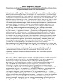 L'école, du latin «schola» signifiant « loisir consacré à l'étude», est un établissement dans lequel est donné un enseignement collectif ou bien une instruction, un exercice militaire.La divergence posée par la définition est essentielle, car l'école est à la fois un lieu d'éveil intellectuel, social et moral.Par conséquent, on comprend donc dès l'étymologie de ce terme que celui-ci est directement relié à une démarche morale et intellectuelle.De plus, le terme «mission» est très important car celui- ci clôture la question, son sens sous-entendu est celui d'un devoir, une notion essentielle à l'éducation et à la citoyenneté.Conséquemment, il apparaît comme une obligation à chacun d'aller à l'école, d'acquérir une certaine éducation et moralité afin de mieux comprendre le monde dans lequel nous vivons mais également refléter un esprit patriotique, montrer la puissance du pays à l'international.En outre, le terme «étude», est une application méthodique de l'esprit cherchant à apprendre et comprendre le microcosme et le macrocosme. De plus, Corinne Lepage, femme de loi énonce: «L'école contribue à la prospérité des sociétés, à l'élimination des discriminations de toutes sortes à la défense de la paix et du bien commun à la meilleure compréhension des peuples».Cependant, après analyse de cette citation, on peut directement formuler d’emblée une objection.La citation «L'élimination des discriminations de toutes sortes à la défense de la paix» est partiellement fausse si on nuance cette formule. Effectivement l'école est un lieu privilégié, constamment soumis, en raison de son identité et du message qu'elle véhicule, à des tensions et contraintes de tous types, accentués par les progrès techniques du monde moderne dans lequel nous vivons.On peut citer l'isolement des personnes handicapées et leur difficulté scolaire à cause du manque d'accompagnement.Ainsi, l'approche éducative et morale de l'école est-elle un vecteur capital dans la transmission du savoir du citoyen en devenir et quelles adversités font office d'écueils à celle-ci ?