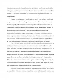 Ou bien la technique est considérée dans son essence comme le signe même de la grandeur de l'homme en tant qu'être de culture qui évolue par son intelligence et sa volonté, mais craindre la technique serait alors craindre l'homme lui-même en considérant qu'il peut s'autodétruire. Ou bien la technique est considérée comme fondamentalement dangereuse dans la mesure où par la complexité des machines elle gagne une autonomie aveugle que l'homme ne peut plus contrôler, mais alors comment -comprendre que ce même instrument de libération puisse aliéner l'homme ?