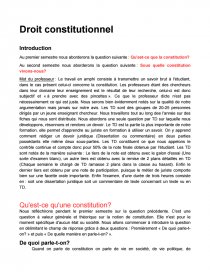 Mot du professeur : Le travail en amphi consiste à transmettre un savoir brut à l'étudiant, dans le cas présent celui-ci concerne la constitution. Les professeurs étant des chercheurs dans leur domaine leur enseignement est le résultat de leur recherche, celui-ci est donc subjectif et « à prendre avec des pincettes ». Ce que le professeur dicte n'est pas nécessairement ce qui est juste. Nous serons bien évidemment notés sur la qualité de notre argumentation mais jamais sur notre avis. Les TD sont des groupes de 20-25 personnes dirigés par un jeune enseignant chercheur. Nous travaillons tout au long dee l'année sur des fiches qui nous sont distribués. Nous abordons une seule question par TD sur laquelle nous développons, résonnons et rendons un devoir. Le TD est la partie la plus importante de notre formation, elle permet d'apprendre au juriste en formation à utiliser un savoir. On y apprend comment rédiger un devoir juridique (Dissertation ou commentaire) en deux parties possédants elle même deux sous-parties. Les TD constituent ce que nous appelons le contrôle continue et compte donc pour 50% de la note finale obtenue par l'étudiant. Les TD sont notés de la manière suivante : Le tiers de la note est obtenu avec le galon d'essai (Une sorte d'examen blanc), un autre tiers est obtenu avec la remise de 2 plans détaillés en TD (Chaque semaine le chargé de TD ramasse 2 plans dans la classe au hasard). Enfin le dernier tiers est obtenu par une note de participation, puisque le métier de juriste comporte bien sur une facette orale importante. Enfin l'examen, d'une durée de trois heures consiste en : soit une dissertation juridique soit un commentaire de texte concernant un texte vu en TD.
