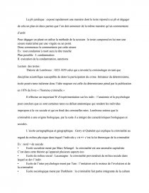 Il effectue un important W d’expérimentation sur les indiv : l’anatomie et la psychologie pour conclure que ce sont certaines tares ou défaut anatomique qui rendent les individus impropres à la vie sociale et qui en fond des criminelles nées. Lombroso estime que la criminalité a une origine biologique, par la suite il a intégré des caractéristiques biologiques et sociales.