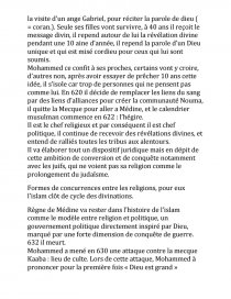 L’islam est née au début du 7 eme siècle quand un homme nommé Mohamet en se réfugiant dans des casernes, reçoit la visite d’un ange Gabriel, pour réciter la parole de dieu ( = coran.). Seule ses filles vont survivre, à 40 ans il reçoit le message divin, il repend autour de lui la révélation divine pendant une 10 aine d’année, il repend la parole d’un Dieu unique et qui est misé cordieu pour ceux qui lui sont soumis.