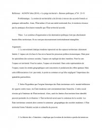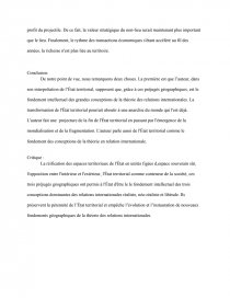 De notre point de vue, nous remarquons deux choses. La première est que l’auteur, dans son interprétation de l’État territorial, supposent que, grâce à ces préjugés géographiques, est le fondement intellectuel des grandes conceptions de la théorie des relations internationales. La transformation de l'État territorial pourrait aboutir à une anarchie du monde qui l'est déjà. L'auteur fait une projecture de la fin de l'État territorial en passant par l'émergence de la mondialisation et de la fragmentation. L'auteur parle aussi de l'État territorial comme le fondement des conceptions de la théorie en relation internationale.