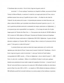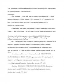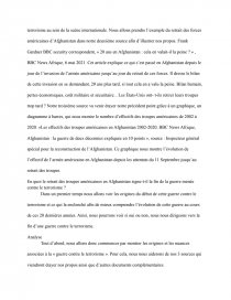 Nous nous focaliserons majoritairement sur le début de la guerre contre le terrorisme afin d’ensuite pouvoir affirmer ou non si nous nous dirigeons actuellement vers la fin de cette guerre menée depuis plus de vingt-ans sur la scène internationale. Pour cela nous appuierons nos propos avec trois sources différentes. La première est un article d'Élie Tenenbaum, « Vers la fin de vingt ans de guerre contre le terrorisme ? », publié dans une revue appelé « Politique étrangère 3/2021 Automne p.137-147 » en septembre 2021. Cet article dresse le bilan de la guerre menée contre le terrorisme plus de vingt ans après les attentats du 11 Septembre. Dans cette article va être expliqué pourquoi le bilan de cette guerre et contrasté et qu’en est-il réellement de la place du terrorisme au sein de la scène internationale. Nous allons prendre l’exemple du retrait des forces américaines d’Afghanistan dans notre deuxième source afin d’illustrer nos propos. Frank Gardner BBC security correspondent, « 20 ans en Afghanistan : cela en valait-il la peine ? » , BBC News Afrique, 6 mai 2021. Cet article explique ce qui s’est passé en Afghanistan depuis le jour de l’invasion de l’armée américaine jusqu’au jour du retrait de ces forces. Il dresse le bilan de cette invasion en se demandant, 20 ans plus tard, si tout cela en a valu la peine. Bilan humain, pertes économiques, coût militaire et sécuritaire... Les États-Unis ont- t-ils retirer leurs troupes trop tard ? Notre troisième source va venir étayer notre précédent point grâce à un graphique, un diagramme à barres, qui nous montre le nombre d’effectifs des troupes américaines de 2002 à 2020. «Les effectifs des troupes américaines en Afghanistan 2002-2020, BBC News Afrique, Afghanistan : la guerre de deux décennies expliquée en 10 points », source : Inspecteur général spécial pour la reconstruction de l’Afghanistan. Ce graphique nous montre l’évolution de l’effectif de l’armée américaine en Afghanistan depuis les attentats du 11 Septembre jusqu’au retrait des troupes.
