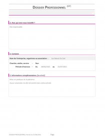 | Le dossier professionnel (DP) constitue un élément du système de validation du titre professionnel. Ce titre est délivré par le Ministère chargé de l’emploi. Le DP appartient au candidat. Il le conserve, l’actualise durant son parcours et le présente obligatoirement à chaque session d’examen. Pour rédiger le DP, le candidat peut être aidé par un formateur ou par un accompagnateur VAE. Il est consulté par le jury au moment de la session d’examen. | |