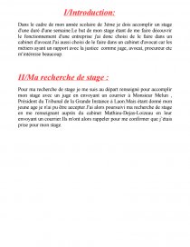 Pour ma recherche de stage je me suis au départ renseigné pour accomplir mon stage avec un juge en envoyant un courrier à Monsieur Melun , Président du Tribunal de la Grande Instance à Laon.Mais étant donné mon jeune age je n'ai pu être accepter.J'ai alors poursuivi ma recherche de stage en me renseignant auprès du cabinet Mathieu-Dejas-Loizeau en leur envoyant un courrier.Ils m'ont alors rappeler pour me confirmer que j’étais prise pour mon stage.