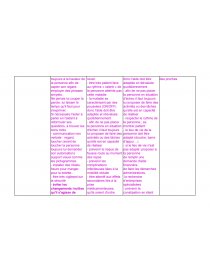 RÔLES AES | - faire un compte-rendu de la journée et le communiquer aux personnes qui prennent le relais directement ou en renseignant le cahier de liaison - accomplir son rôle de soutien familial, d'information et de transmission auprès des proches - communication verbale : une voix calme et posée en se mettant toujours à la hauteur de la personne afin de capter son regard, employer des phrases simples. Ne jamais lui couper la parole, lui laisser le temps qu'il faut pour s'exprimer. Si nécessaire l'aider à parler en l'aidant à reformuler ses questions, à trouver les bons mots. - communication non verbale : regard, toucher (avant de toucher la personne toujours lui demander son autorisation) support visuel comme les pictogrammes - installer des rituels : heure pour manger, pour la toilette... - être très vigileant sur la sécurité - éviter les changements inutiles qu'il s'agisse de l'environnement, des habitudes, des rituels car le familier procure un sentiment de sécurité | -faire un compte-rendu de la journée et le communiquer aux personnes qui prennent le relais directement ou en renseignant le cahier de liaison -accomplir son rôle de soutien familial, d'information et de transmission auprès des proches - être attentif aux besoins et désirs de la personne dès son réveil. - être très patient face au rythme « ralenti » de la personne atteinte pas cette maladie. - la maladie se caractérisant par des poussées (ON/OFF) donc l'aide doit être adaptée et réévaluée quotidiennement - afin de ne pas placer la personne en situation d'échec il faut toujours lui proposer de faire des activités ou des tâches qu'elle est en capacité de réaliser - prévenir le risque de fausse route au moment des repas - prévenir les complications infectieuses liées à la mobilité réduite - être attentif aux effets secondaires liés à la prise médicamenteuses, qu'ils soient d'ordre physiques ou psychiques | -faire un compte-rendu de la journée et le communiquer aux personnes qui prennent le relais directement ou en renseignant le cahier de liaison - accomplir son rôle de soutien familial, d'information et de transmission auprès des proches - la maladie se caractérisant par des poussées (ON/OFF) donc l'aide doit être adaptée et réévaluée quotidiennement - afin de ne pas placer la personne en situation d'échec il faut toujours lui proposer de faire des activités ou des tâches qu'elle est en capacité de réaliser - respecter le rythme de la personne ; se montrer patient - le lieu de vie de la personne doit être adapté (douche, barre d'appui....) - si le lieu de vie n'est pas adapté :proposer à la personne de remplir une demande d'aide financière, de faire les démarches administratives, la recherche d'entreprises spécialisées - prévenir la constipation en étant vigilant sur l'hydratation et l'alimentation, encourager la personne à bouger lorsqu'elle le peut. | -faire un compte-rendu de la journée et le communiquer aux personnes qui prennent le relais directement ou en renseignant le cahier de liaison - comprendre la maladie, s'adapter à son évolution, apport d'1 aide psychologique -accomplir son rôle de soutien familial, d'information et de transmission auprès des proches |
