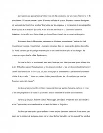 Il est évident aujourd’hui que l’Amérique a manqué à ses promesses à l’égard de ses citoyens de couleur. Au lieu d’honorer son obligation sacrée, l’Amérique a délivré au peuple Noir un chèque en bois, qui est revenu avec l’inscription “ provisions insuffisantes ”. Mais nous refusons de croire qu’il n’y a pas de quoi honorer ce chèque dans les vastes coffres de la chance, en notre pays. Aussi, sommes-nous venus encaisser ce chèque, un chèque qui nous donnera sur simple présentation les richesses de la liberté et la sécurité de la justice.