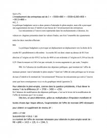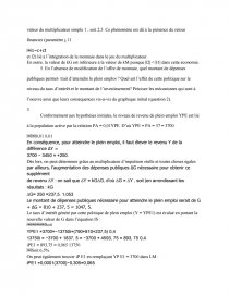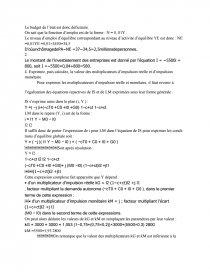 3. Sachant que le nombre d’emploi N de cette économie (en millions de personnes) est déterminé par l’équation N = 0, 01Y et que la population active totale P A est de 37 mil lions de personnes, déterminez pour cet équilibre le niveau du solde budgétaire, le montant de l’investissement des entreprises, le volume d’emploi et le nombre de chômeurs.