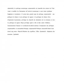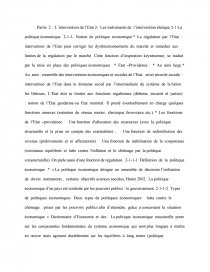 Partie 2 : L’intervention de l’Etat 2- Les instruments de l’intervention étatique 2-1 La politique économique 2-1-1- Notion de politique économique * La régulation par l’Etat : intervention de l’Etat pour corriger les dysfonctionnements du marché et remédier aux limites de la régulation par le marché. Cette fonction d’inspiration keynésienne, se traduit par la mise en place des politiques économiques. * Etat –Providence : * Au sens large * Au sens : ensemble des interventions économiques et sociales de l’Etat. strict sécurité sociale. : intervention de l’Etat dans le domaine social par l’intermédiaire du système de la Selon les libéraux, L’Etat doit se limiter aux fonctions régaliennes (défense, sécurité et justice) : notion de l’Etat gendarme ou Etat minimal. Il prend éventuellement en charge quelques fonctions annexes (entretien du réseau routier, électrique, ferroviaire, etc.). * Les fonctions de l’Etat –providence · Une fonction d'allocation des ressources (avec la politique structurelle et la prise en compte des externalités) ; · Une fonction de redistribution des revenus (prélèvements et ré affectations) · Une fonction de stabilisation de la conjoncture (croissance équilibrée et lutte contre l'inflation et le chômage par la politique conjoncturelle). On parle aussi d'une fonction de régulation. 2-1-1-1 Définition de la politique économique * « La politique économique désigne un ensemble de décisions l’utilisation de divers instruments , certains objectifs sciences sociales, Hatier 2002. La politique économique d’un pays est conduite par les pouvoirs publics : le gouvernement. 2-1-1-2 Types de politiques économiques Deux types de politiques économiques · lutte contre le chômage. : prises par les pouvoirs publics afin d’atteindre, grâce à concernant la situation économique » Dictionnaire d’Economie et des · La politique économique structurelle porte sur les composantes fondamentales du système économique qui sont plus longues à mettre en œuvre mais agissent durablement sur les équilibres à long terme (politique industrielle). La politique économique conjoncturelle est ensemble des actions de l’Etat visant à modifier les fluctuations de l’activité économique à court terme (politique budgétaire et monétaire) ; Il existe deux grands types de politique conjoncturelle : une politique de relance et une politique de rigueur. ü La politique de relance (Go), d'inspiration keynésienne, privilégie les objectifs de stimulation de la croissance et de ü La politique de rigueur (Stop) privilégie quant à elle la lutte contre l'inflation, l'assainissement financier et la réduction du déficit extérieur. Comparaison des politiques conjoncturelles et structurelles Politique conjoncturelle Politique structurelle Durée Court terme Long terme Objectifs Maintien des équilibres Effets Quantitatifs Adaptation des structures Qualitatifs
