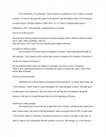 Like most hotels, "Four Seasons" seeks to better its customer service in order to continue to satisfy. To achieve this goal the group "Four seasons" uses the Maslow theory This hierarchy was theorized by Abraham Maslow (1908-1970), in « A Theory of Human Motivation » published in 1943. This hierarchy is represented as a pyramid :