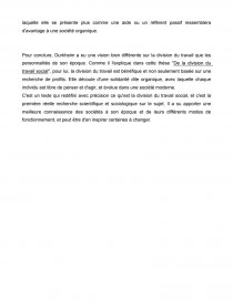 C'est de cette dernière que découle la division du travail. En effet, l'auteur conçoit cette notion comme un phénomène social, qui ressemble à un partage de fonctions et de tâches différentes, ce qui augmenterait considérablement la solidarité et l'interdépendance entre les différents individus d'une société. Ce partage ne serait pas rendu possible dans une société mécanique, étant donné que chaque individu se ressemble, que les tâches demandées sont similaires, un échange ne serait bénéfique pour personne vu que tout le monde à les mêmes idées et les mêmes positionnements dans la société.