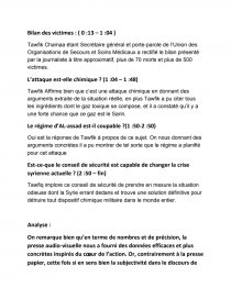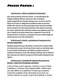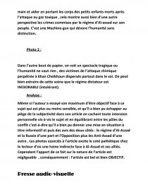 Dans cette première partie de l’article , la correspondante de LeFigaro Delphine Minoui a posé une mise en situation spatio-temporelle de l’attaque chimique qui a eu lieu en Syrie le Mardi 4 avril dans le village Khan Chaikhoune dans la province d’Idlib. Elle a donné une brève description des moments horribles que les citoyens ont vécus après plusieurs raids aériens successifs, les avions répandent des manteaux toxiques qui asphyxie jusqu’à la mort, d’après les premiers bilans cela a engendré la mort de 58 personnes dont 11 enfants, ces attaques ont aussi endommagés les infrastructures et les sites hospitaliers.