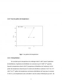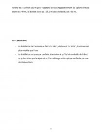 On constate que la température du mélange initial Ti=10C° (avant l’opération de distillation), l’opération de distillation ne commence qu’à T=20C° (1ere goutte). Quand la température étant à 58 C°( température d’ébullition de l’acétone) c’est le palier de température observé pour le volume de distillat en acétone V=19.7 ml. A T= 102 C° le 2éme pallier de température commence (distillation de l’eau) pour le volume V=19.5 m, ces températures avec coïncident avec les valeurs théoriques qui sont : de l’ordre de : 56 ml et 100 ml pour l’acétone et l’eau respectivement .Le volume initiale étant de : 40 ml, le distillat étant de : 39.2 ml donc le résidu est : 0.8 ml.