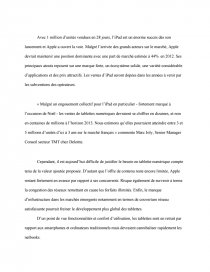 Avec 1 million d’unités vendues en 28 jours, l’iPad est un énorme succès dès son lancement et Apple a ouvert la voie. Malgré l’arrivée des grands acteurs sur le marché, Apple devrait maintenir une position dominante avec une part de marché estimée à 44% en 2012. Ses principaux atouts reposent sur une marque forte, un écosystème solide, une variété considérable d’applications et des prix attractifs. Les ventes d’iPad seront dopées dans les années à venir par les subventions des opérateurs.