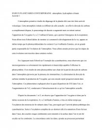 L'atmosphère primitive résulte du dégazage de la planète dû à une très forte activité volcanique. Cette atmosphère initiale se différait de celle actuelle : en effet le dioxyde de carbone a complètement disparu, le pourcentage de diazote a augmenté mais on retient surtout l’apparition de l’oxygène il y a 2.5 milliard d’année, qui a permis l'émergence de la respiration. Nous allons tout d’abord tâcher de montrer ici comment le développement de la vie, apparu en même temps que la photosynthèse(dans les océans) il ya 4 milliards d’années, est en grande partie responsable de l’évolution de l’atmosphère. Nous allons ensuite prouver que les étapes de cette évolution sont inscrites dans certaines roches.