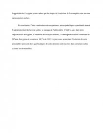En conclusion, l’intervention des microorganismes photosynthétiques cyanobactériens et le développement de la vie a permis le passage de l’atmosphère primitive, qui était alors dépourvue de dioxygène, et très riche en dioxyde carbone, à l’atmosphère actuelle constituée de 21% de dioxygène de seulement 0.03% de CO2. Le processus permettant l'évolution de cette atmosphère prouvent alors que les étapes de cette dernière sont inscrites dans certaines roches comme les stromatolites.