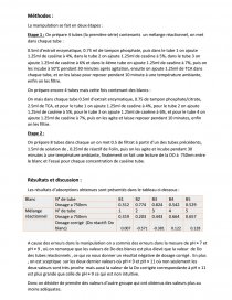0.5ml d’extrait enzymatique, 0.75 ml de tampon phosphate, puis dans le tube 1 on ajoute 1.25ml de caséine à 4%, dans le tube 2 on ajoute 1.25ml de caséine à 5%, dans le tube 3 on ajoute 1.25ml de caséine à 6% et dans le 4éme tube on ajoute 1.25ml de caséine à 7%, puis on les incube à 50°C pendant 30 minutes après agitation, ensuite on ajoute 1.25ml de TCA dans chaque tube, et on les laisse pour reposer pendant 10 minute à une température ambiante, enfin on les filtre.