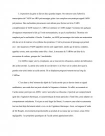 L’expression du gène se fait en deux grandes étapes. On retrouve tout d’abord la transcription de l’ADN en ARN pré-messager grâce à un complexe enzymatique appelé ARN-polymérase. Des nucléotides précurseurs sont utilisés pour former un brin d’ARN complémentaire d’ADN transcrit. L’ARN est similaire à l’ADN malgré l’existence de quelques divergences notamment le fait qu’il soit monocaténaire, et que le nucléotide à Thymine soit remplacé par le nucléotide à Uracile. Toutefois, cet ARN pré-messager doit subir une maturation afin de servir de matrice à la synthèse des protéines. C’est le processus d’épissage qui permet ceci : des séquences d’ARN appelées introns sont supprimées, tandis que d’autres, codantes, appelées exons, sont raccordées entre elles. Ainsi, la structure de l’ARNm est faite de la succession de codons, groupes de 3 nucléotides.