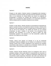 Sinopsis: en este capítulo, Goleman examina la desigualdad entre empresas y consumidores en términos de datos clave sobre productos específicos que pueden influir en las decisiones de compra. Señala que incluso los programas de ecoetiquetado no abordan por completo esta "asimetría de la información". Sugiere que la transparencia radical permitiría a los consumidores aprender la historia completa sobre los verdaderos impactos de sus compras.