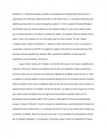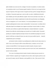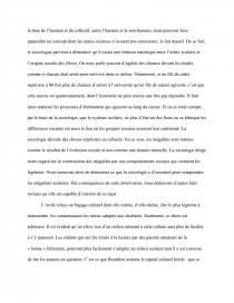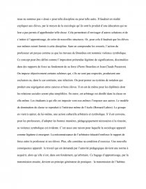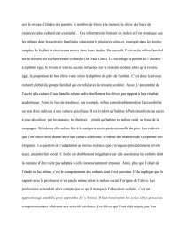 L’école relaye un bagage culturel dont elle estime, d’elle-même, être le plus légitime à transmettre, les connaissances les mieux adaptés aux étudiants. Seulement, ce choix est arbitraire. Il est évident qu’un élève issu d’un milieu attenant à cette culture aura plus de facilité à s’y épanouir. Les enfants qui ont été initiés à la lecture par des parents amateurs de la « bonne » littérature, pourront plus facilement s’adapter au milieu scolaire tant il y est convenu de lire les auteurs en question. C’est ce que Bourdieu nomme le capital culturel hérité : que ce soit le niveau d’études des parents, le nombre de livres à la maison, le choix des lieux de vacances (plus culturel par exemple)… Ces informations forment un indice et l’on remarque que les enfants dont les activités familiales coïncident le plus avec celui-ci, enseigné dans les écoles, ont plus de facilité et réussissent mieux dans leurs études. De surcroît, l’action du milieu familial sur la réussite est exclusivement culturelle (M. Paul Clerc). La sociologie a permis de l’illustrer : à diplôme égal, le revenu n’exerce aucune influence sur la réussite scolaire alors qu’à revenu égal, la proportion de bon élève varie selon le diplôme du père de l’enfant. C’est donc le niveau culturel global du groupe familial qui est relié avec la réussite scolaire. Aussi, L’ancienneté de l’accès à la culture d’une famille sépare individuellement les élèves par rapport à leur résultat académique. Ainsi, le lieu de résidence, par exemple, influe considérablement sur l’accessibilité ou non d’un individu à une culture spécifique. Il est évident qu’habiter à Paris manifeste un accès à plus de culture, par les musées, les théâtres… plutôt qu’habiter en milieu rural, au fond de la campagne. Résidence elle-même liée à la catégorie socio-professionnelle du père. Les endroits que l’on côtoie nous donne ainsi une culture différente, et même des manières de s’exprimer très éloignées. La question de l’adaptation au milieu scolaire, que j’évoquais précédemment, révèle aussi, un autre fait social. L’école est doublement inégalitaire car elle sanctionne les enfants dont la manière d’être n’est pas adaptée à celle inconsciemment imposée. Ainsi, plus que l’objet de l’étude en lui-même, c’est le comportement des enfants dont il est question. Cela implique que le rapport avec le professeur n’est pas le même selon le milieu social d’origine de l’élève. Les professeurs se rendent alors compte que ce qu’il manque à l’éducation scolaire, c’est un apprentissage parallèle pour apprendre à s’y former. Il faut transmettre les codes et les processus comportementaux inhérents aux activités scolaires. Les élèves qui l’ont déjà acquis, par leur sphère familiale sont, encore une fois, avantagés. On assiste à un paradoxe, le système scolaire