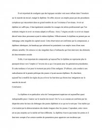 Le diplôme certifie un niveau de connaissances ou de compétences pour les diplômes professionnels. Il est reconnu comme acquis, soit après des études et la réussite à un examen, soit par équivalence, notamment, en France, dans le cadre de la reconnaissance des acquis de l'expérience. Le chômage quant à lui est un des maux de la dérégulation de marché de travail et traduit le déséquilibre entre l’offre d’emploi et la demande. Il représente l'ensemble des personnes de 15 ans et plus, privées d'emploi et en recherche active.
