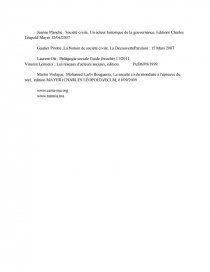 La société civile n'a ni statut, ni personnalité juridique, mais des contours imprécis. Seuls des associations, des ONG, des cercles de réflexion, des groupes de pression... en font partie. Les individus ne participent donc à la société civile que par leur intermédiaire. Ces entités, qui ne sont pas toujours formellement organisées, ont en général un domaine d'intervention spécialisé (droits de l'homme, environnement, social...). Leur objectif est d'influer sur les politiques publiques et les choix politiques ..."