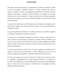 D’une durée de 2 mois débutant en décembre, ce stage nous a donné l’occasion d’exercer et mettre à l’épreuve les connaissances vues pendant cinq années d’étude à la FSJESK, ce qui nous a permis de concevoir une idée plus précise, quant à l’usage des différentes disciplines acquises en dehors de l’enceinte universitaire, et d’allier la théorie et la pratique dans un cadre purement organisationnel.