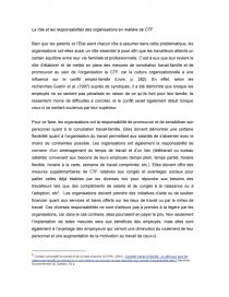 Bien que les parents et l’État aient chacun rôle à assumer dans cette problématique, les organisations ont-elles aussi un rôle essentiel à jouer afin que les travailleurs atteints un certain équilibre entre leur vie familiale et professionnelle. C’est à eux que leur revient le rôle d’élaborer et de mettre en place des mesures de conciliation travail-famille et de promouvoir au sein de l’organisation la CTF, car la culture organisationnelle a une influence sur le conflit emploi-famille (Livre, p. 282). En effet, selon les recherches Guérin et al. (1997) auprès de syndiqués, il a été démontré que lorsque les employés ne se sentent pas pénalisés en raison de ce qu’ils font pour leur famille, ils ressentent moins de difficultés à concilier, et le conflit serait également réduit lorsque ceux-ci se sentent soutenus par leur supérieur.