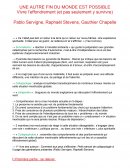 UNE AUTRE FIN DU MONDE EST POSSIBLE Vivre l’effondrement (et pas seulement y survivre) Pablo Servigne, Raphaël Stevens, Gauthier Chapelle → « Ce n’était pas tant un retour à la terre qu’un retour sur nous-mêmes. Une expérience spirituelle. C’était pour se guérir, se redécouvrir et s’affirmer. » (Tee Corinne) → Survivalisme : « réaction à l’anxiété ambiante » qui guide la préparation aux grandes catastrophes par la recherche d’autonomie, c’est-à-dire d’indépendance vis-à-vis des systèmes d’approvisionnement